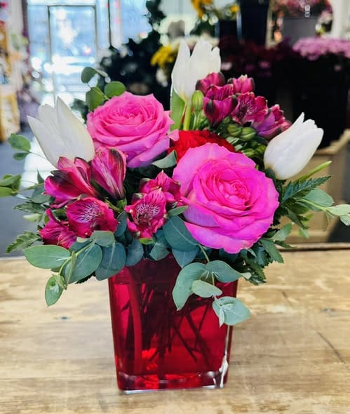 Those hot-pink roses are doing all the “self-love + bestie love” energy, the white tulips keep it classy, and the pops of magenta feel flirty without trying too hard. And that red vase?? Bold, confident, main-character vibes.